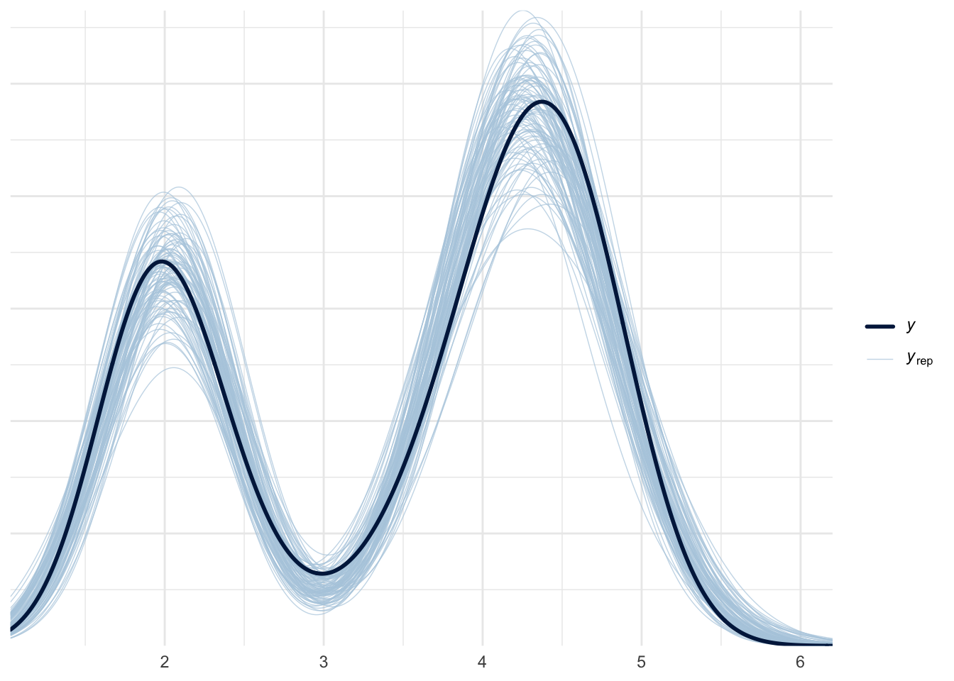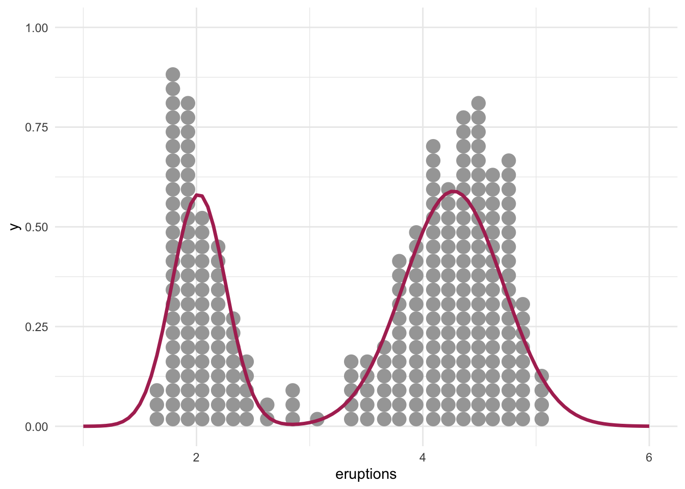 # geom_dots()The data looks bimodal. We can come up with a simple mixture model: