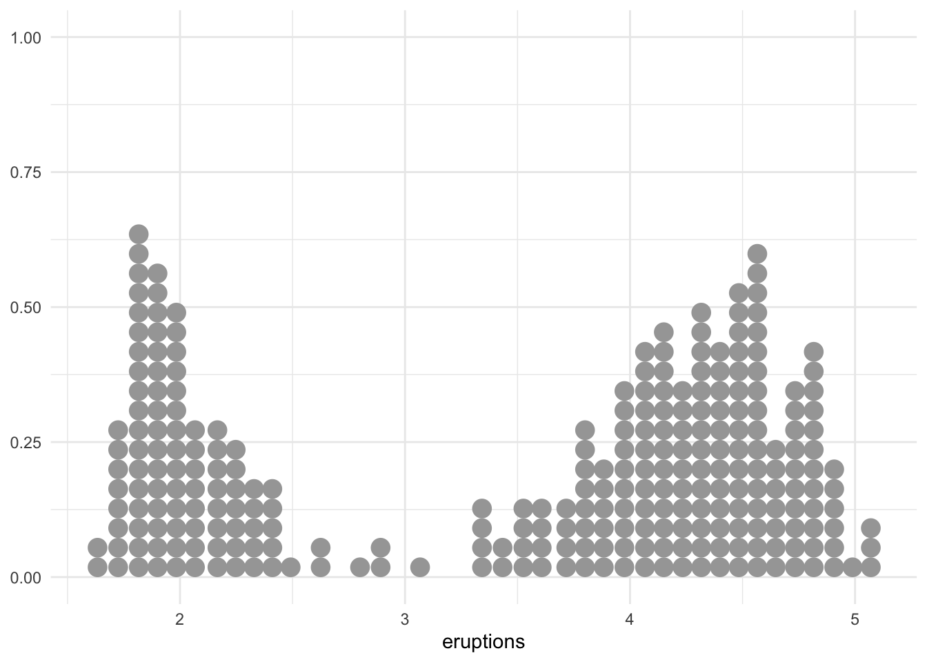 geom_dots(data = faithful, aes(x = eruptions)) +
