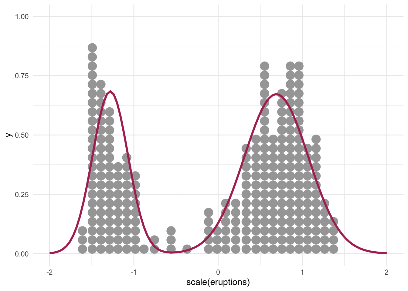 geom_dots(data = faithful, aes(x = scale(eruptions))) +