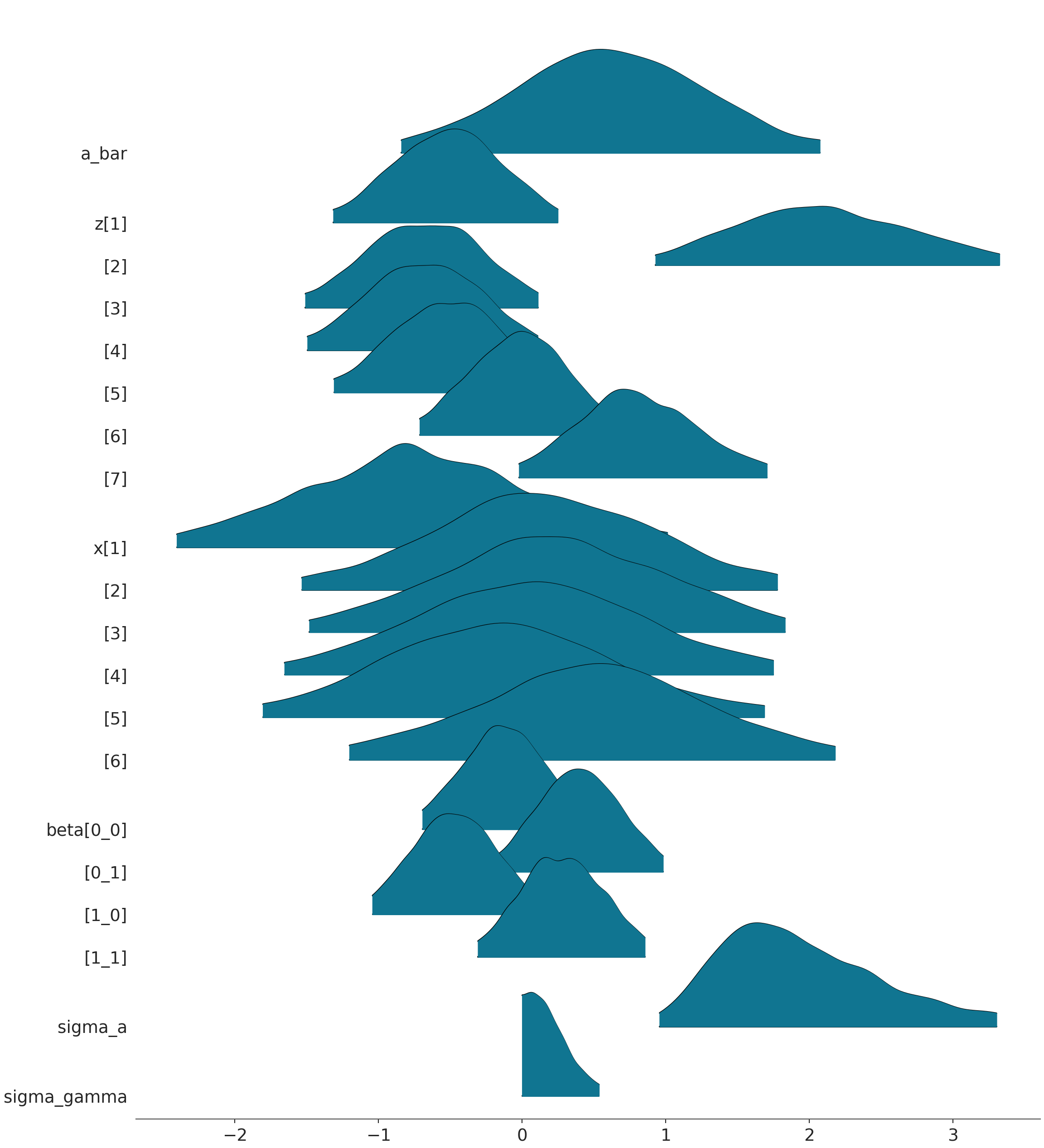 az.plot_forest(chimp_model_trace, kind='ridgeplot', combined=True, hdi_prob=0.95)array([<Axes: title={'center': '95.0% HDI'}>], dtype=object)